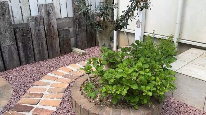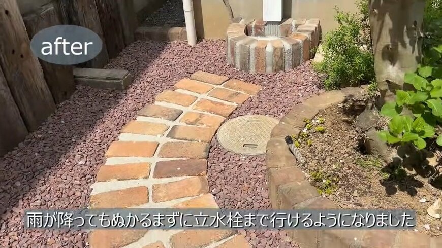 DIYした立水栓と同じアンティークのレンガを使って小道を作り、雨が降っても立水栓まで行けるようになりました。