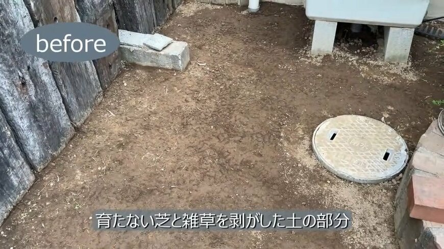 ビフォーアフターがこちらです。育たない芝と雑草をはがした土の部分が、洋風なレンガ造りのお庭に大変身しました。