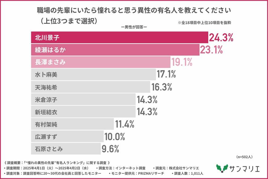 - 株式会社サンマリエ「【職場にいたら惚れてしまう?】異性の先輩芸能人は「北川景子」「鈴木亮平」が1位!職場恋愛の実態も明らかに…!」