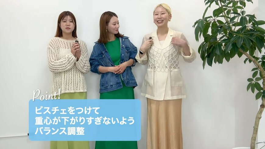また、太ももの付け根より丈が長いサヤカさん(右端)は、「ビスチェをつけて重心が下がりすぎないように調整」しているそうです。白のジャケットの上からパールのビスチェと同系色の異素材のものを合わせて、おしゃれ見えさせていますね。