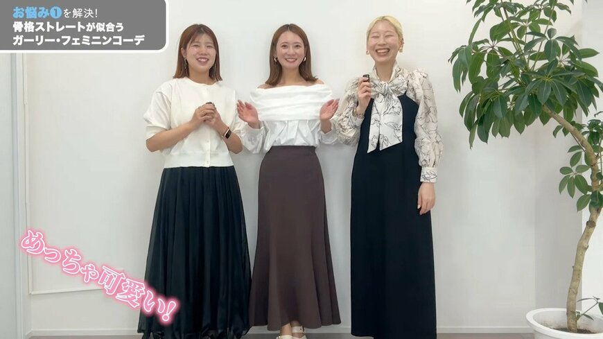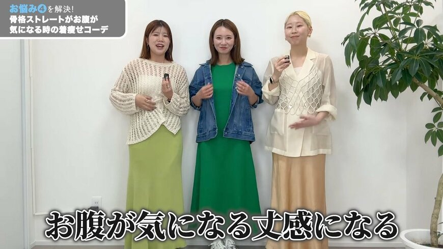 2つ目のコツは、マイさん(中央)が取り入れている、「ワンピースですべてのシルエットを隠してしまうこと」。