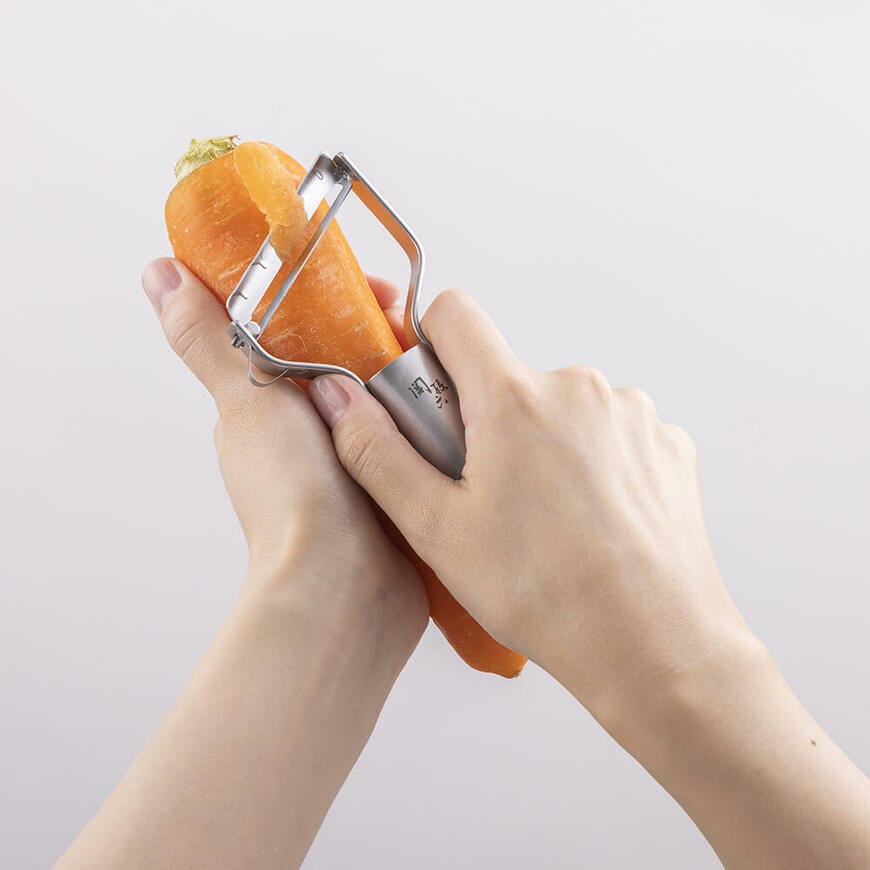 「軽い力でするする剥ける」「薄く剥けて無駄がない」といった使い心地の良さが魅力の「関孫六 オールステンレス 鋭角ピーラー 極刃」。食材を支えながら軽い力でピーラーを動かせば、スムーズに調理が進みます。手が小さな人でも扱いやすいコンパクトなサイズ感も、使いやすさを高める要素のひとつです。