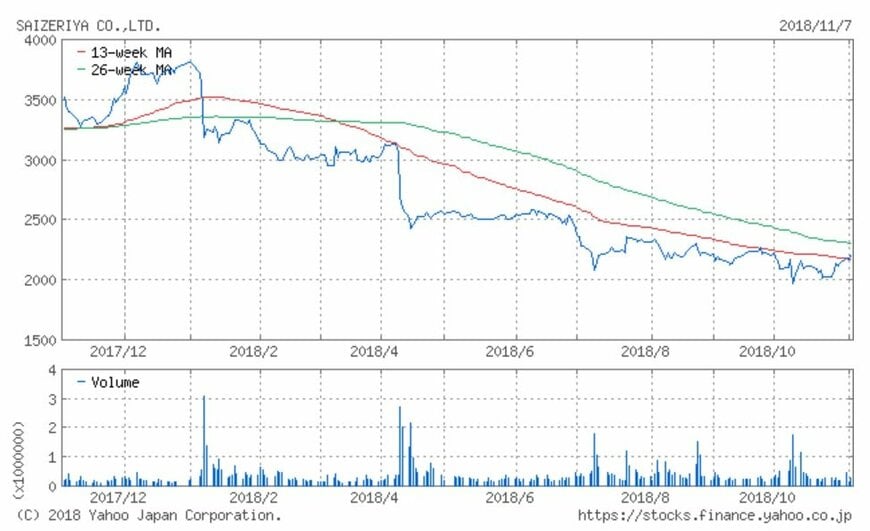 株価は2018年に入ってから上昇を見せることなく下落が継続しています。年初は3,000円を超えていた株価ですが、10月には一時2,000円割れとなる事態も発生しています。