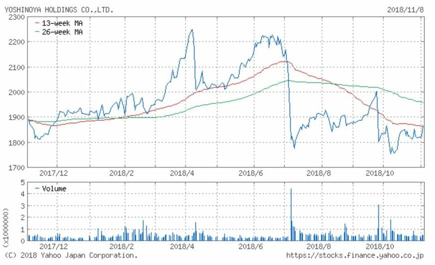 吉野家HDの株価は、2018年に入り方向感なく上下の値動きを見せています。具体的には、1月の1,900円台の水準、4月の2,200円台の水準、そして7月と10月の1,700円台の水準の3つの節目価格を意識しながら上下が継続しています。