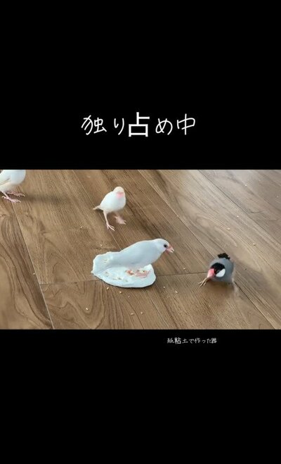 3. 【エサを独り占めする文鳥】「ぎゃっゴメンナサイっ!」仲良くご飯を食べてね。