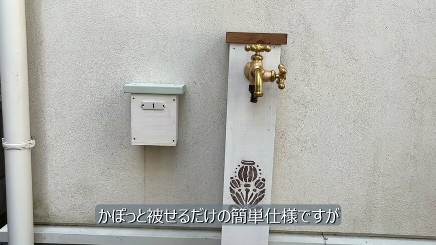 まずは細かなDIY作業。立水栓近くの外部コンセント部分を隠すカバーを端材で制作しました。かぶせるだけの簡単DIYですが、洋風な雰囲気に合ってかわいらしいです。