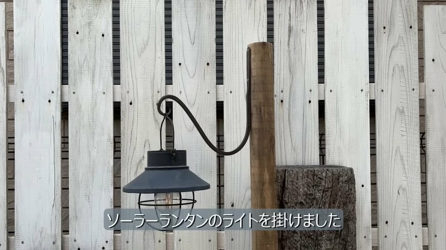次は余った丸太を加工して、枕木に固定して、アイアンフックを付けました。akaneさんはかわいらしいソーラーランタンで装飾しています。