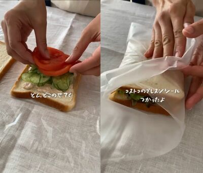 このプレスンシールを使えば、簡単にサンドイッチが包めて汁も漏れずに安心です。