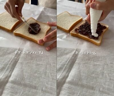 あんこをぬって、市販のホイップクリームを絞るだけ!なのにどうでしょう。もうこの時点で「デザートに絶対美味しい」のがわかる不思議。