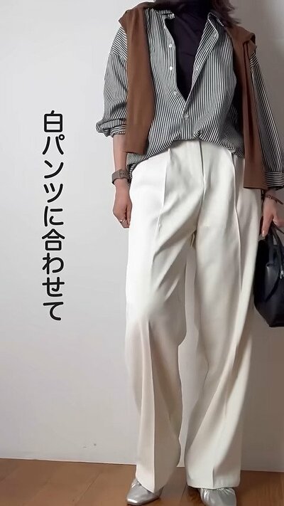 まずは白のパンツに合わせて爽やかに春らしく。インナーとバッグは黒でまとめて、ブラウンのニットを肩掛けしてアクセントにしています。シャツのボタンは大きく開けて、インナーの黒を見せています。ストライプ柄も黒色なのでシンプルに落ち着いて見えますね。
