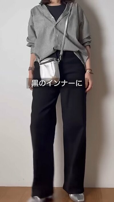 次は黒パンツを合わせたコーディネート。インナーも黒で統一しています。バッグと靴はシルバーで差し色に。モノトーンにまとめてよりシックな印象にまとめています。なおさんは「黒は引き締まる」と解説しています。