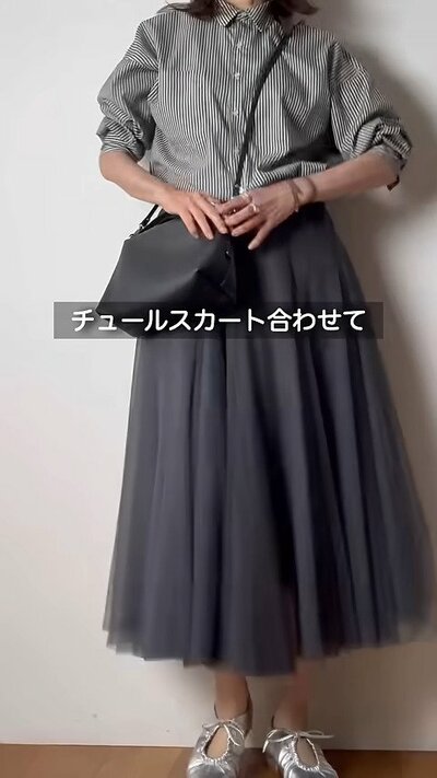 4. 【大人女性におすすめ!ストライプシャツの高見え着こなし3コーデ】チュールスカートでかわいらしさをプラス
