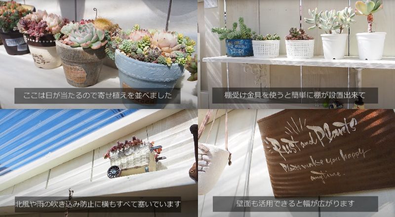 壁も活用して吊り下げ型の鉢を飾ったり、日当たりを考えて置きたい種類を考えたり、自分の好きなように多肉植物を楽しめる小屋は、風雨をしっかりとしのげるようにできています。