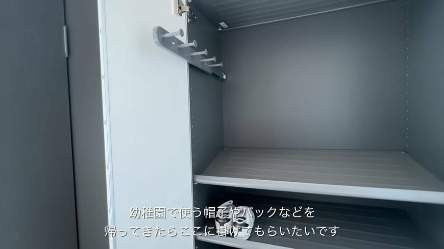 子供さんも手が届くよう、靴箱の下段を子供用靴置き場に。伸縮するハンガーも設置し、「帽子やバッグをかけてもらいたい」と父親としての願いも込められた空間になりました。