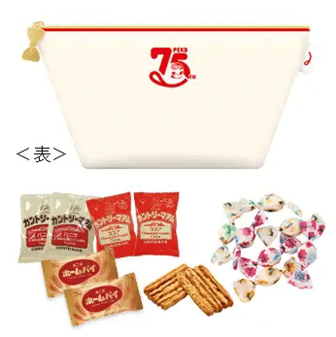 今年で75周年を迎えるペコちゃんの「75周年ロゴ」が入った限定デザインのポーチに、不二家の人気菓子を詰め合わせ。