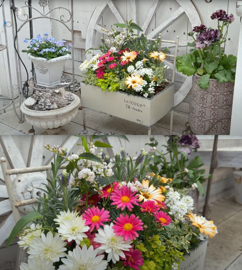 ブリキでできた味わいのある鉢に、沢山の花が咲き乱れ、そして高さも色の配置も、バランスを考えて寄せ植えされた鉢が完成しました。
