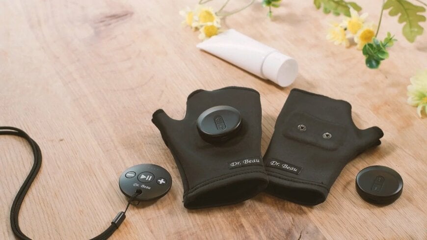 「Beau-te」の使い方は、付属の美容クリームを塗ってグローブを装着し、ボタンを押して電源を入れるだけ。強弱を調整できるコントローラー付きです。