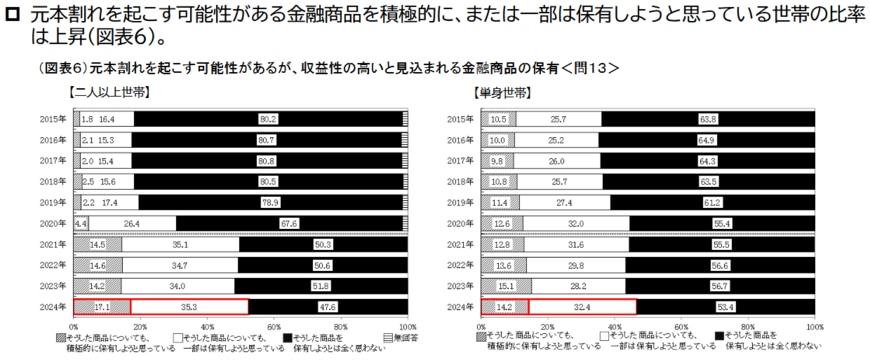 2024年12月18日に公表されたJ-FLECの調査(図表6)によれば、元本割れの可能性がある商品について「積極的に保有したい」「一部は保有したい」と答えた世帯の合計が、二人以上世帯で4割超に達しました。