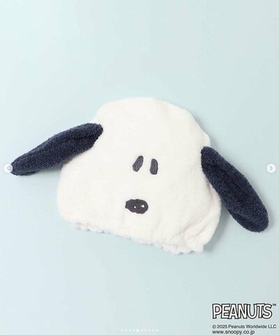 こちらはスヌーピーのフェイス型ヘアドライキャップ。マイクロファイバーで濡れた髪の毛の水分をしっかり吸収。