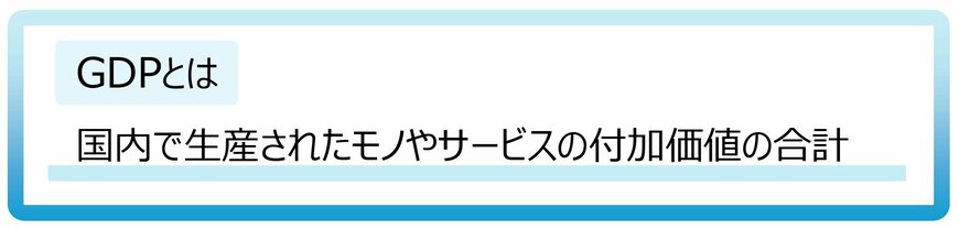 GDP(=Gross Domestic Product)は国内総生産のことですが、国内で生産されたモノやサービスの付加価値の合計を表しています。