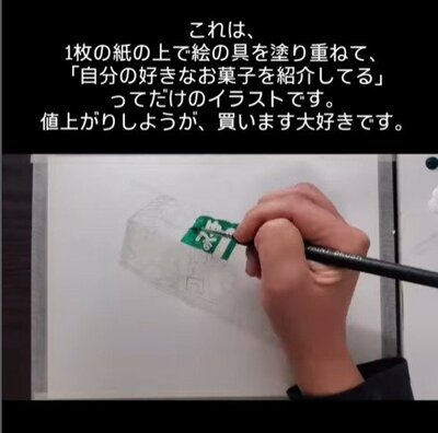 「1枚の紙の上で絵の具を塗り重ねて自分の好きなお菓子を紹介してるってだけのイラスト」