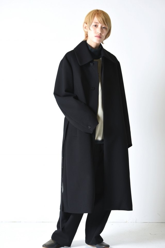 114cmという長い着丈が目を引く『ETHOSENS』のロングコート。細番手糸特有の滑らかさと落ち感、二重織り特有の膨らみと打ち込みの良さが相まって、他にはない独特の触感が魅力です。