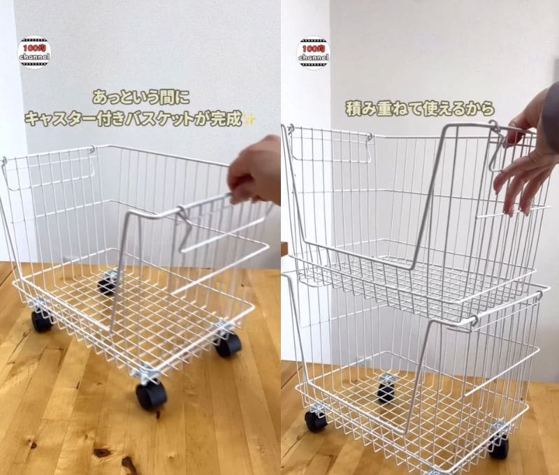 ワイヤーバスケットの取っ手を内側にすれば、積み重ねて使うことも可能なので、乗せられる荷物も大容量!