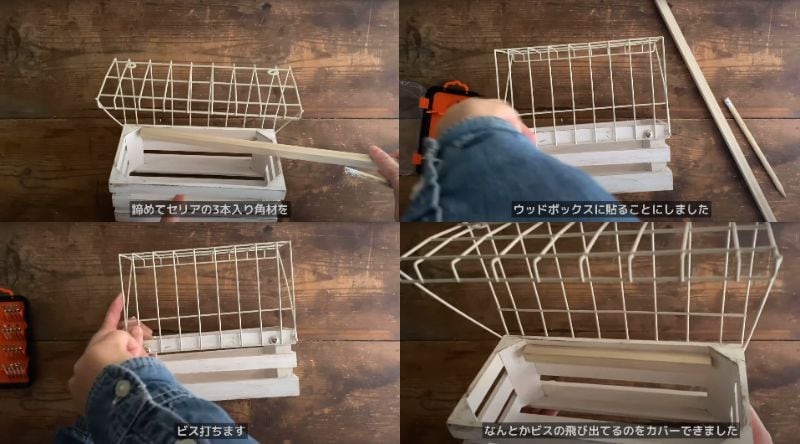 セリアの「3本入り角材」を用いてウッドボックスにボンドで張り付けて、ビスが飛び出ないように対処しました。