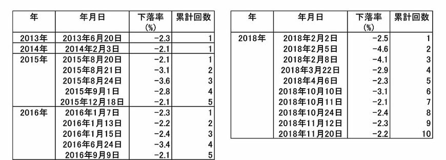 次の特徴としては、大幅下落となる日は比較的ある時期に集中して発生することが分かります。2015年の夏、2016年の年初、そして2018年の2月〜3月、同じく2018年の10月〜11月が大幅下落が集中した時期です。