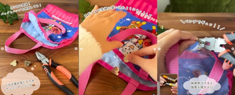 ホックの爪がバッグの生地に食い込むようにセットしてギュッと留めます。