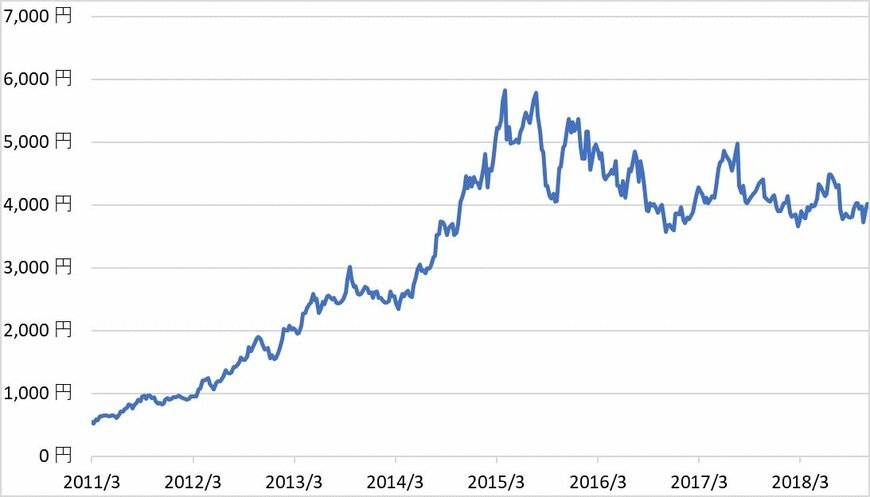図表2はカルビーの株価推移です。株価は右肩上がりで、上場来8年弱で株価は約8倍になっています。株価上昇の要因がすべて値上げによるものだと言うつもりはありませんが、少なくとも投資家は業績好調を見込んでいたと考えられます。