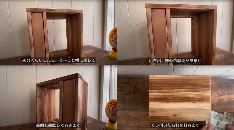 まずは、キャビネットの外枠と引き出し部分をボンドでくっつけていきますよ。