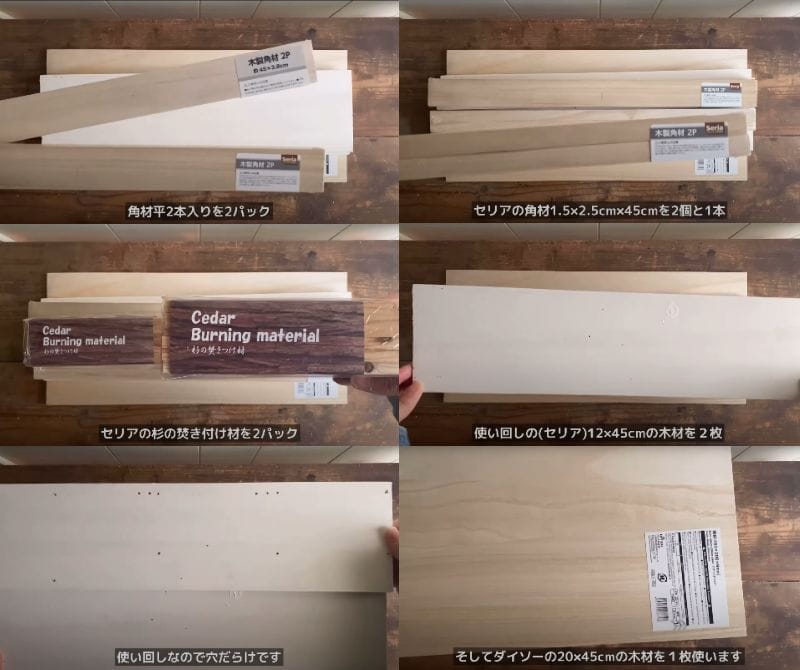 セリアで購入できる角材、杉の焚きつけ剤、再利用した木板、そしてダイソーの木板を使って作ります。