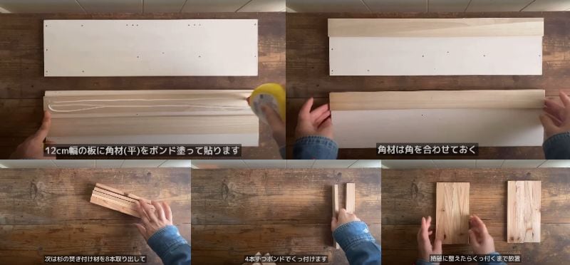 12cmの板に、角を合わせてボンドで角材をつけていきます。