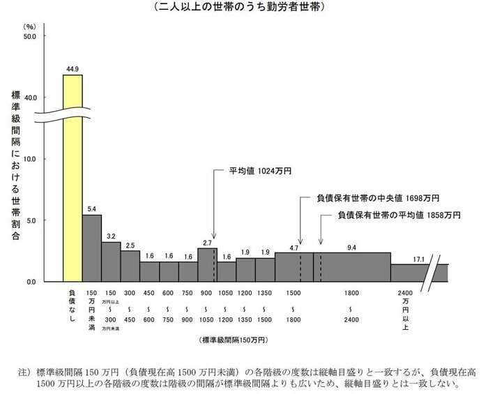 総務省統計局の「家計調査報告(貯蓄・負債編)―2024年(令和6年)平均結果―(二人以上の世帯)」から、、二人以上世帯のうち働く世帯(勤労者世帯)全体の貯蓄と負債を眺めてみましょう。