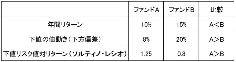 また、リターンを下方偏差で割った比率を「ソルティノ・レシオ」と言い、その比率が高ければ高いほど、マイナスリターン幅に対してより大きなリターンを得ていると考えられます。