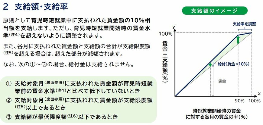 「育児時短就業給付金」は時短勤務中の賃金額の10%相当額ですが、時短開始時の賃金水準を超えないよう調整されます。支給対象月に賃金が低下していない場合や、支給限度額である45万9000円以上、または最低限度額の2295円以下の場合は支給されません。