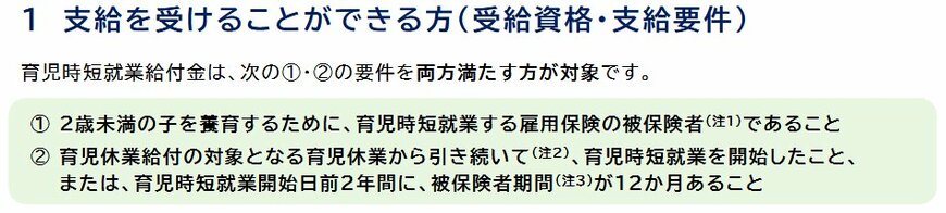 - 育児休業からの継続または時短勤務開始日前2年間に雇用保険の被保険者期間が12か月以上あること