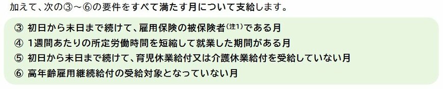 さらに、「育児時短就業給付金」が支給されるための月ごとの要件として、月の初日から末日まで雇用保険被保険者であり、時短勤務を行い、かつ育児休業給付、介護休業給付、高年齢雇用継続給付を受給していない月に支給されます。