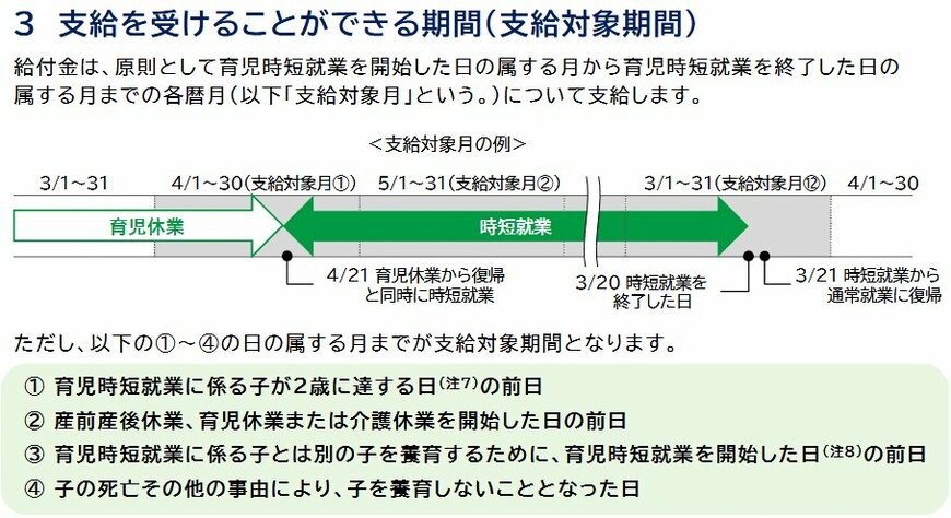 「育児時短就業給付金」は原則として育児時短就業開始月から終了月まで支給されます。ただし、子が2歳に達する前日、産前産後休業・育児休業・介護休業開始の前日、他の子を養育するための時短開始前日までなど、支給対象期間が決まっています。