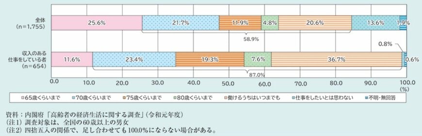 全体のおよそ6割(58.9%)が「70歳くらいまで」「75歳くらいまで」「80歳くらいまで」「働けるうちはいつまでも」と回答しており、多くの高齢者が長期間にわたり仕事をしたいと考えていることがわかります。