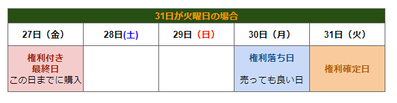 権利付き最終日:権利確定日の2営業日前!(この日までに株式を保有している必要があります)