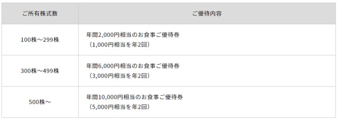 - 1年間に2回、以下のとおり、お食事ご優待券が発行され、各株主に贈呈されます。