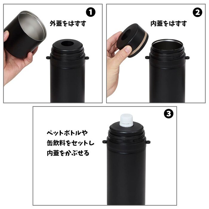 2. 付属の内蓋を使用することでペットボトルや500〜600ml缶をいつでも飲み頃キープ