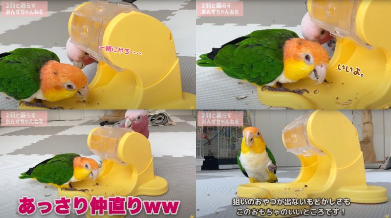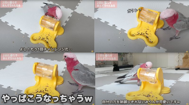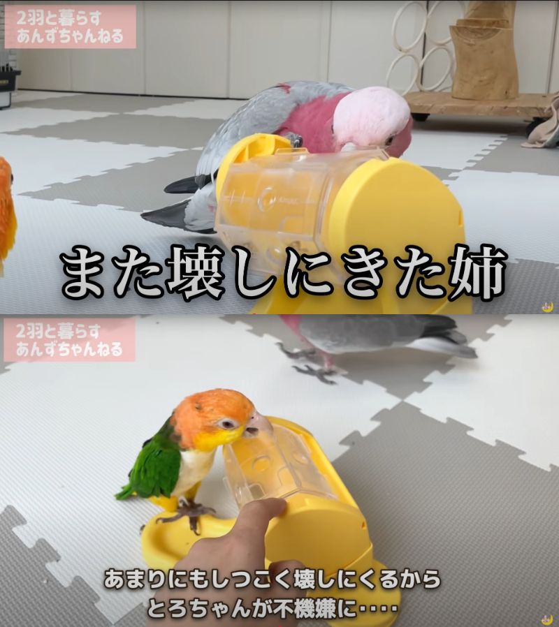 3. 【おもちゃに大興奮のインコ】何度も壊すインコにイライラするインコ