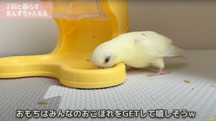 姉妹インコが散らかしたエサのおこぼれにあずかっております(笑)