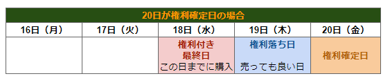 - 権利付き最終日:権利確定日の2営業日前!(この日までに株式を保有している必要があります)