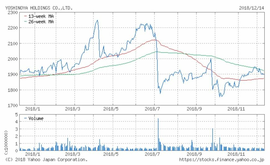 吉野家HDの株価は、2018年に入り方向感のない値動きを見せています。1月の1,900円台、4月の2,200円台、そして7月と10月の1,700円台の3つの節目価格を意識しながら上下する動きが継続しています。なお、11月は上昇が続いた結果、12月は2,000円回復目前の値位置から取引を開始しています。