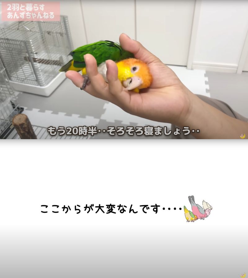 1. 【寝たくないインコ】今日も寝る時間になりました...が、ここからが格闘スタート!