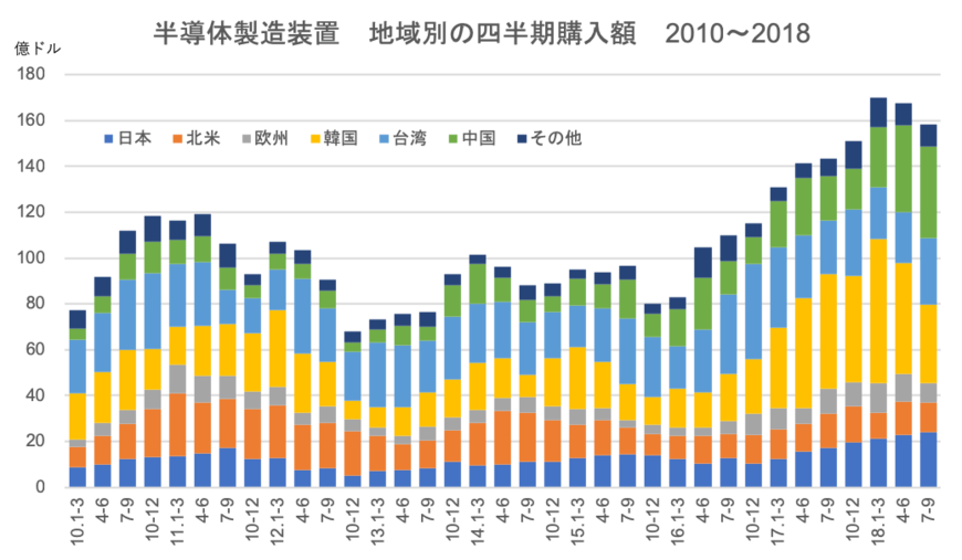 半導体製造装置の地域別出荷額は、2011年1~3月期に北米が首位になった以外、2010年以降は四半期ベースで韓国か台湾がずっと首位を維持してきた。台湾には世界最大のファンドリーであるTSMC、韓国にはメモリー市場で世界1位と2位にあるサムスン電子とSKハイニックスがあり、世界の他の地域よりも旺盛な設備投資を間断なく実施しているためだ。